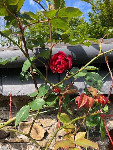 There's a rose flowering outside my studio door! It's not a great looking rose—I think those that are still buds right now will be nicer. But still—there's a rose outside my door!