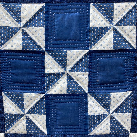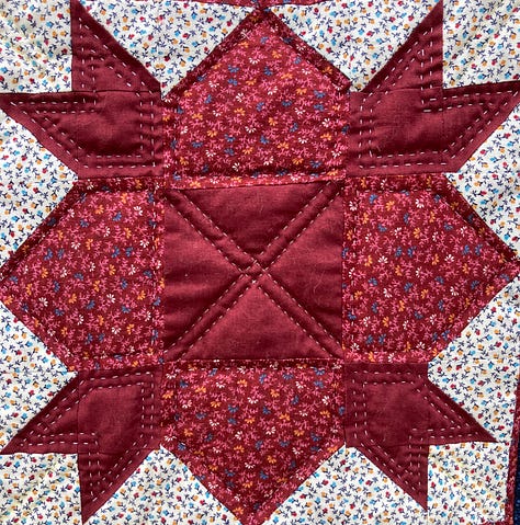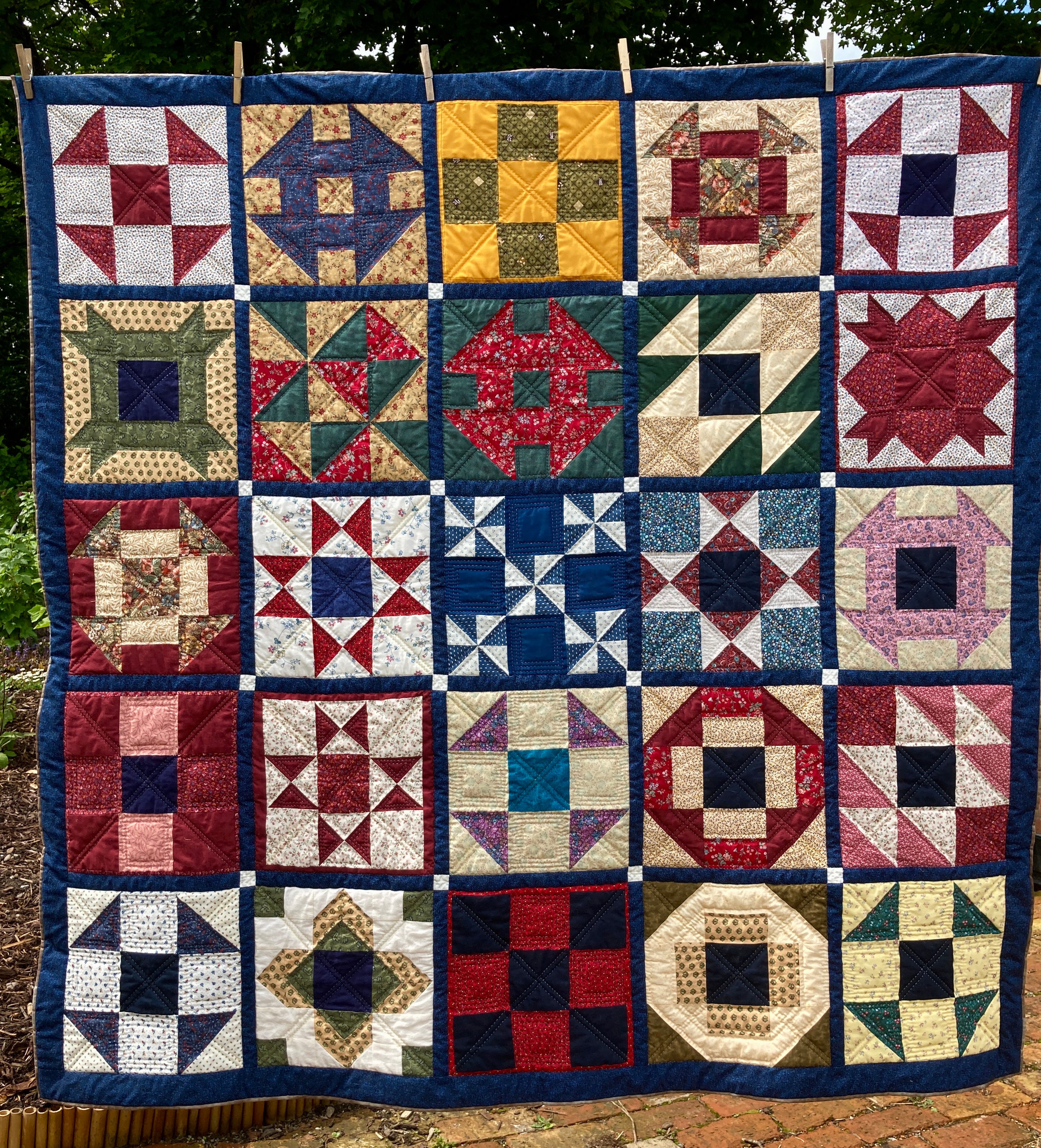 It’s hard to believe that it’s almost a year since we started this project — April 2020, to be exact. Today, I finished putting in the final stitches binding the edges of the quilt. The original plan, when we thought we’d be done with COVID after the first lockdown, was to get us together in the Heritage Centre for an old fashioned quilting bee. But that possibility never became a reality. As we entered into Lockdown 3+, I decided to assemble the quilt top, set it up on my big frame and hand quilt it . The nights were long, the days wet and dreary, and I found the peace of quietly stitching away while listening to the radio (Lyric) or a book on Audible created a “happy place” that even the failure of the Trump Impeachment could not invade. I’m posting this for my patchwork buddies — the women who put together the 25 Nine Patch blocks from scrap fabrics that make up this quilt.