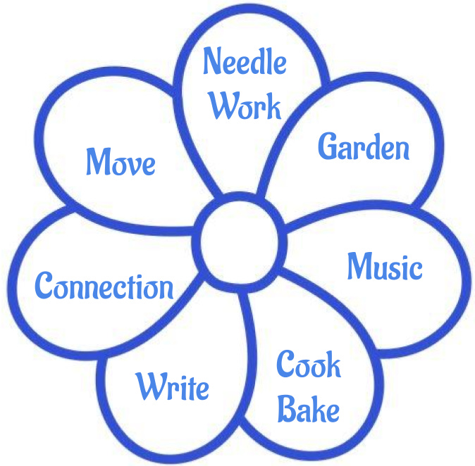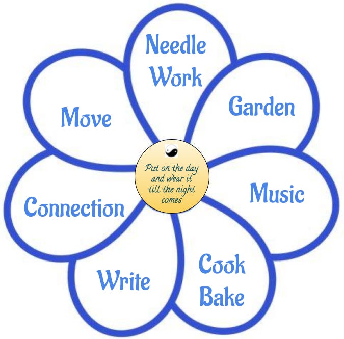 In writing my Morning Pages today I found myself creating a mental image of my days as a seven petaled flower. To be honest, it started out as five petals but then I found that wasn’t enough to feel “completeness”—the feeling of contentment in having a day full of things I wanted to do. Seven is my birthdate, a magic and portentous number. So seven petals it would be. I doodled and then created this image…