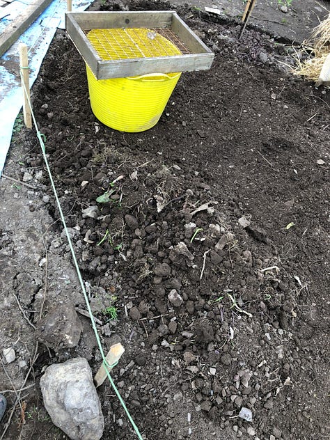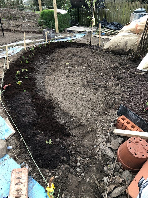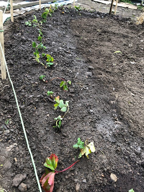 In the 10'x12' greenhouse garden (so-called because it's the garden bed closest to the greenhouse), I finally got the 25 strawberry plants in the ground. This was a huge undertaking because we had been walking over that section while we built the compost bin system and it had pretty much dried into concrete. I spent a couple of days forking it over, then raking it and pulling out stones and roots until I had a reasonable tilth. I then mounded, added compost and went to work putting the bare root strawberries in place.