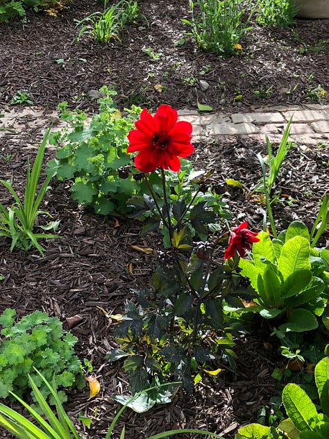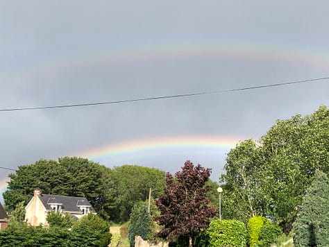 We had a gorgeous double rainbow on Friday—it was one of those days when the sun and the rain played tag all day long. And our first dahlia, Bishop of Llandalf bloomed—a stunning red in the afternoon glow. And the days are still dry enough for haymaking. This will be the first week when people can go anywhere in their home county and, to other counties, 20 km from their home base. And we can have a small group (4-6) people over if we can maintain appropriate social distancing. That shouldn't be a problem in our garden.