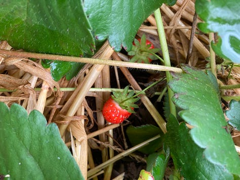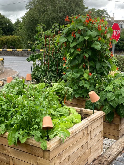 Today, our dinner was accompanied by yellow and green french beans and lovely new potatoes from our garden. Earlier today, I brought a big bunch of rainbow chard up to a neighbor for their dinner. In a little while, I will treat myself to a serving of gooseberry crumble, the fruit courtesy of another neighbor who was overwhelmed by the abundance of his bushes. Life here, in this moment, is very good. I finally found the GIY website and their 12-week gardening videos—a homegrown Waterford success story! They are wonderful and inspiring. So much so that I'm ready to add another couple of raised beds for growing things in spaces we didn't know what to do with. So I went to Quickcrop's website and ordered a couple of VegTrugs—Hey Presto! One and a half square meters of garden without all the hard landscaping! I'm excited. We also saw a home gardening video on BBC's Gardeners World where a viewer has created a wall of strawberry plants, solving a couple of problems: the whole "straw" bedding thing to keep the dirt off the fruit... and greedy, sneaky slugs. You know what happens. You espy a lovely big strawberry a day or two away from being just perfect to pick and you come back the next morning to half of it eaten away. The disappointment! So Robbie and I are going to up-cycle a couple of sturdy pallets and create a "wall" with "shelves" for strawberry plants in pots in a nice south facing spot that has the added advantage of screening off the compost area. I'll wait until the fall to transplant our strawberry plants to that new location and use the resulting ground space for more plants in the herb garden.