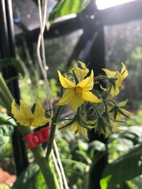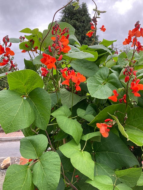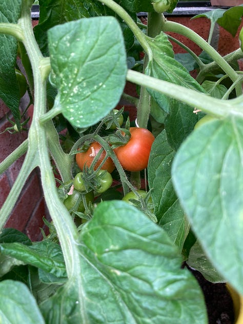 I've been checking my tomatoes, french beans, sweet corn and courgette (zucchini), as well as the new Brussel sprout and lettuce seedlings, every day. We're at the point where the things that are bearing fruit, especially the tomatoes growing in containers in the greenhouse, need feeding every week. Well, all that work is finally being rewarded. The big surprise this morning was a gleam of orange red behind the giant tomato leaves—two tomatoes ripening up! I was so excited, I went around the garden to find what else might be hiding from me under the leaves—aside from the dreaded slugs... ugh!