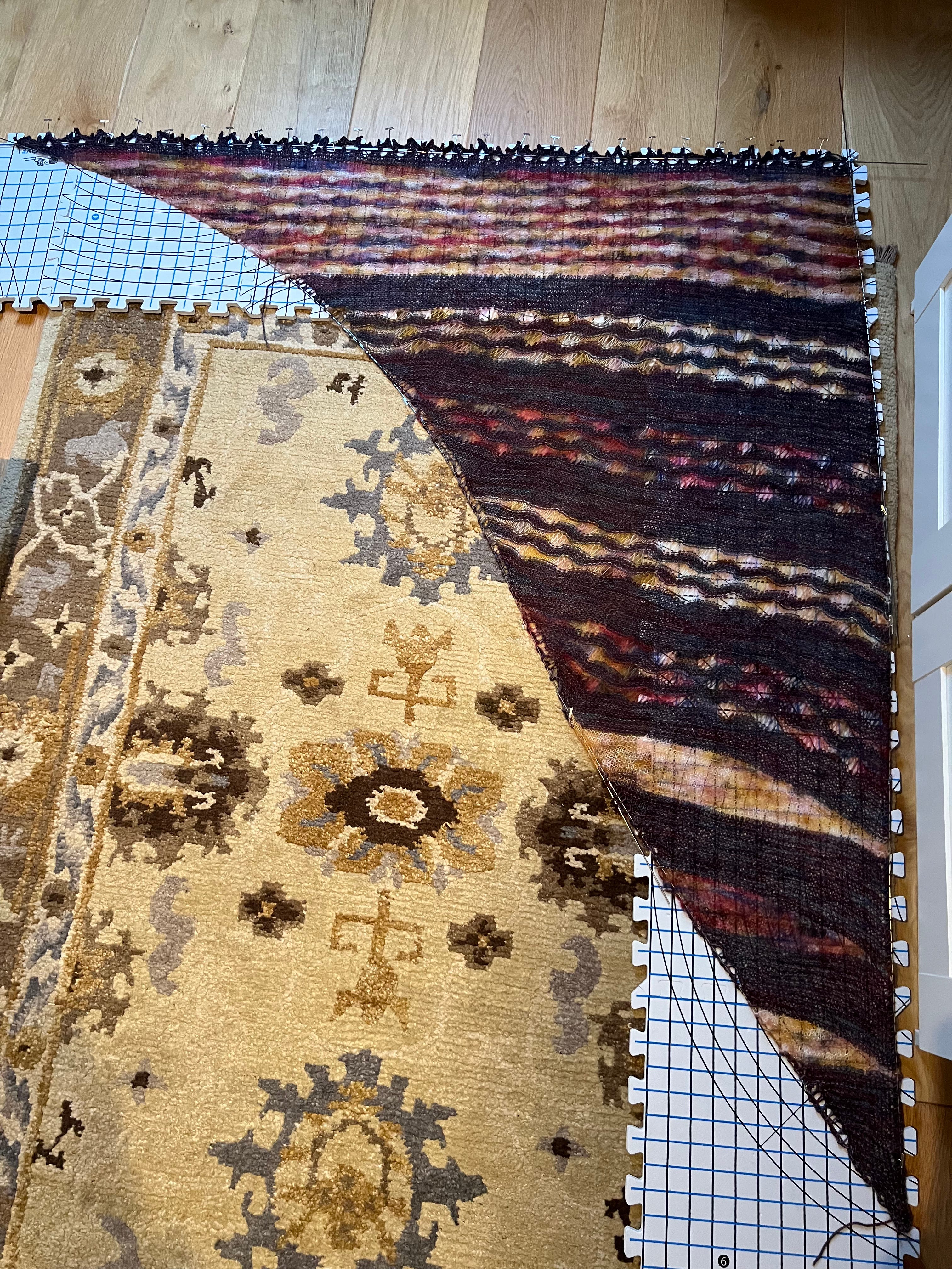 To be honest, the finishing of a knitting project is hardly ever my favorite part. Blocking, weaving in the tails of the yarn, all a bit fussy and laborious. And yet, on a misty, rainy day, with no new project on the needles, what else can you do? So, to the sink to wash and wet the garment, wrap it in a towel and squeeze out any extra moisture, and on to the floor to open it out with long wires, pins and interlocking blocking squares.