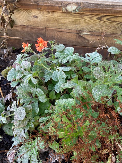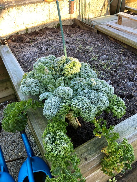 After weeks of very mild weather—mostly wet—we woke to a blue sky, bright sun and a magical frosted landscape. The sun is still so low in the sky that much of the garden white with frost will stay that way all day, while other parts are rapidly returning to green. It is oddly cheering after so much fog, mist and rain—the three forms of wet we've been having for the past few months. Oh, we get the odd sunny spell thrown in. Just enough to draw us out for a walk, only to catch us with some windy rain halfway home. But we DO NOT complain! Because our kids—even those in Seattle—have been shoveling snow. We are grateful that we don't face waking up to THAT.