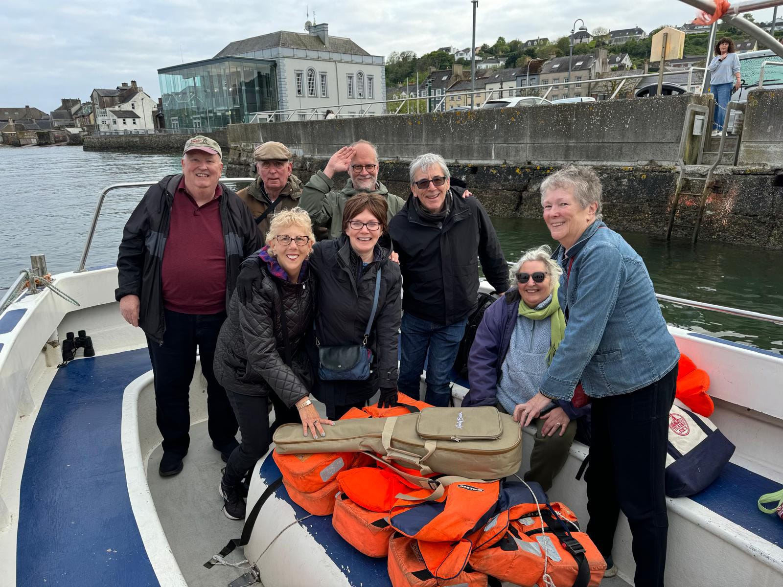 There were some family things in May that got us out of the house and back into the swing of things. Robbie’s cousin Leish brought the ashes of their cousin Cáit to be interred in the family plot in Carrick-on-Suir. The following Tuesday we took Leish and her husband with us on Tony Gallagher’s boat up the Blackwater—the long trip with a picnic in Villierstown. While the sun wasn’t actually shining (no surprise there), it was pleasant and almost warm and, as my mother would say, any day on the water is a great day. Later that month, Máirtín de Cógáin invited us to a session at The Local in Dungarvan. Robbie’s cousin Dónal was there with an amazing box player, Joseph Mannion—definitely a man to watch! Robbie reckons he’ll get the All-Ireland this year. At some point in the evening a Bodhrán solo started. It soon became FOUR bodhráns. Often that’s considered three too many but not this night! See the video: