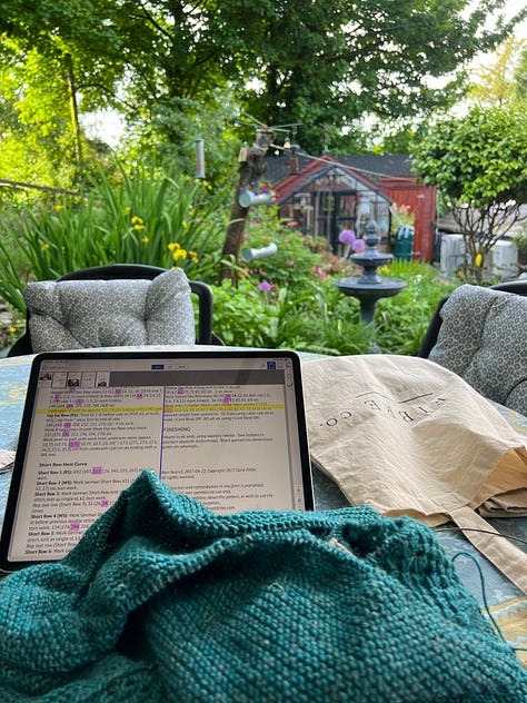 Happily, all that rain meant I spent a lot of time knitting and piecing quilts. I have one quilt ready to put on the frame. I’m doing that one for my granddaughter. I’m planning another for a daughter-in-law. These will have to be finished by September when the family will be over here for a weeklong trip. I may get going on those projects this week. In the meantime, I’m finished with the second project (a cowl) in one KAL (Knit Along) club and coming to the end of another KAL (a cardigan). Sadly, I have not even started with the third one but as it’s a blanket throw made of twenty 10” squares I should catch up soon. I really must get my impulse to buy yarn and patterns and join project clubs under control! I had great intentions of using up as much of the wool in my stash as I could but my desire to learn new techniques and undertake the challenges of a mystery knit along is hard to resist.
