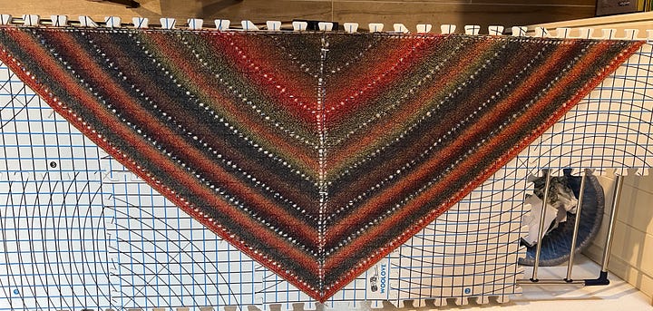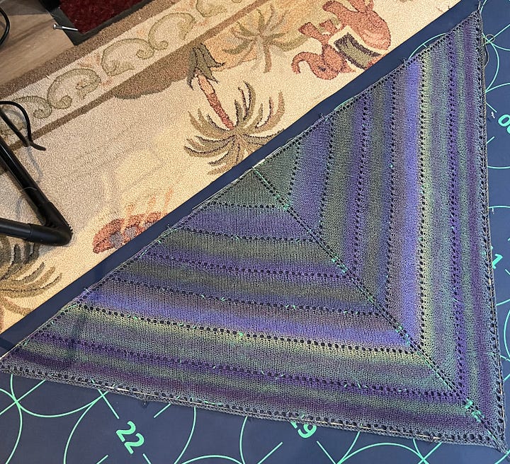 Two of the shawls were 1 skein projects I found on Ravelry when I looked for what I could do with two skeins I had bought when the yarn shop in Warren, RI folded. That was probably over 15 years ago and I finally was able to do something with them. I finished knitting them around Christmas but, since I didn't have anyone in mind, they just sat there, unblocked, unfinished. Talking to a neighbor today, I learned that her sister, Patricia, is in hospice and I asked would she like anything... maybe one of these shawls. My neighbor thought it would cheer her up no end so I went straight to work with blocking it. It should be dry tomorrow and be ready to be sent up when my neighbor goes to visit her sister in Waterford city. That is the trick, for me, of getting something finished—figure out who will get it.