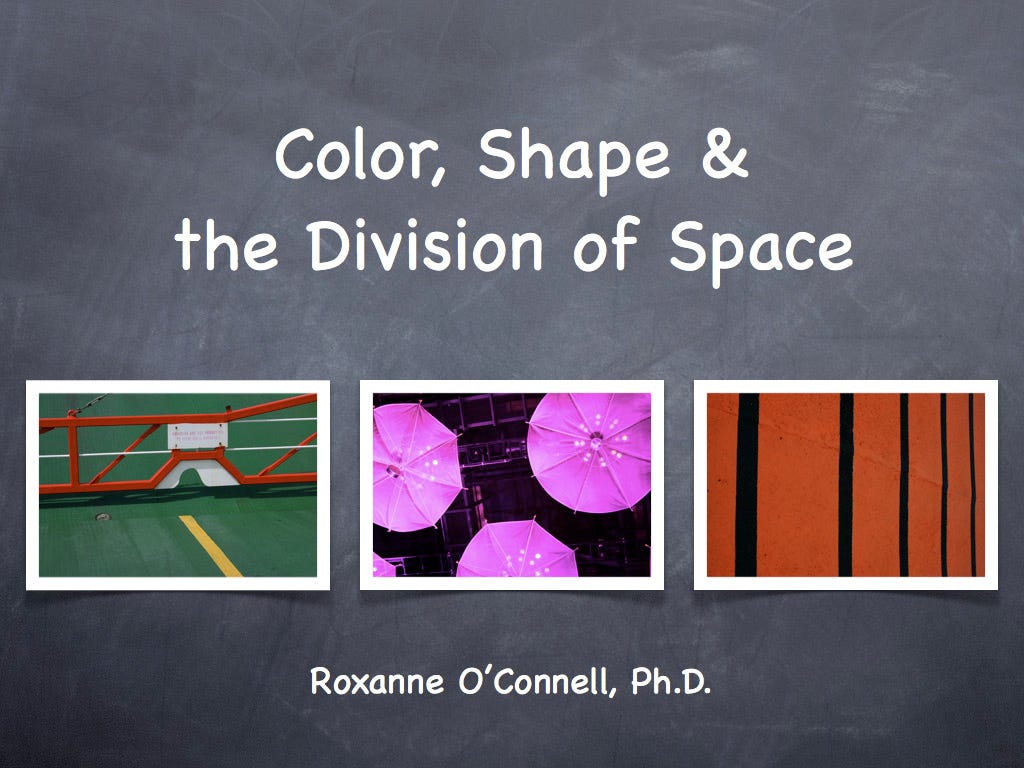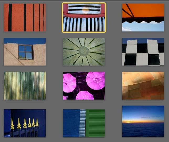 These are 12 of my own photos. They feature abstractions that focus on color, shape and the division of space. I want to render them or re-present them using fabric and stitchery. It may mean abstracting them further... or, for some, it will be mimesis.