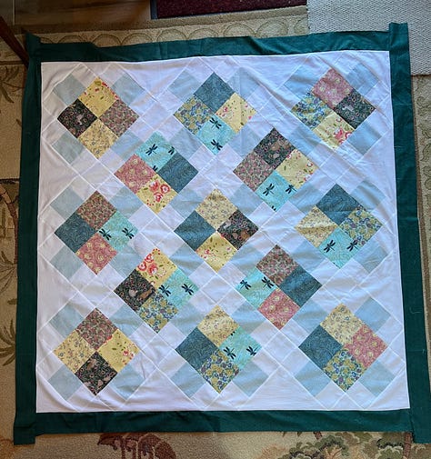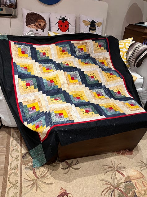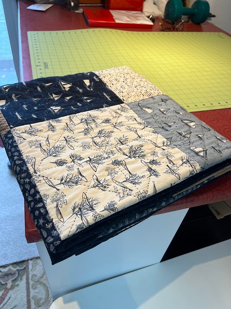 That's what led to Mick & Paula's Anniversary Quilt—a log cabin quilt made of scrap fabrics. I even carefully stitched together the batting from leftovers. The backing was some fabric I had bought yards of thinking that I would make curtains when we moved to Bristol, RI, but never used because I was in a new job and then decided to go back to school for my PhD. It's interesting that the fabrics I'm drawn to tend to be 100% cotton (and the yarns tend to be luxurious wools!). I've also been known to buy the rest of the bolt if there's only a yard or so left.