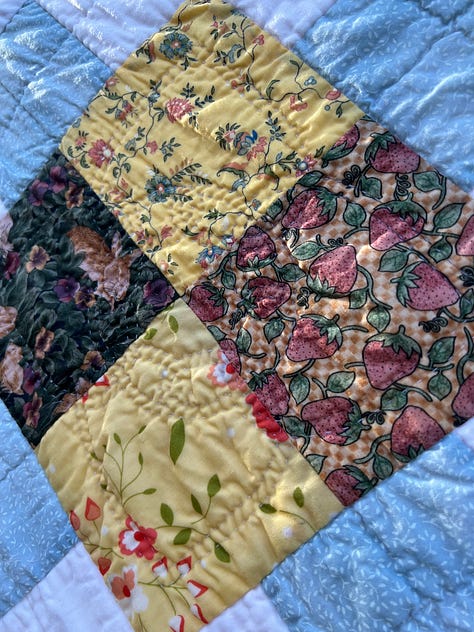 What is a scrap quilt? It's a quilt where you use, as much as possible, fabric leftover from other projects. New fabric can be bought for the background or borders, but you get an extra thrill when you can keep that to a minimum, or not use "new" at all! My first scrap quilt is the one we have on our bed. In it are fabrics I used for other quilts and my daughter's little dresses. It took 20 years to finish because I had several twists and turns in my professional life as well as a move to a smaller house with no room to set up my big frame, so it stayed rolled up under the bed in the spare room. It was the specter of having to move it unfinished YET AGAIN that goaded me into finishing it before we came to Ireland in 2017.
