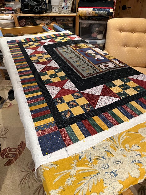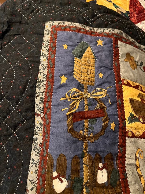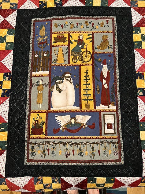 I've discovered the constraints that come with only using what you've got have actually push me to be more creative and daring in my use of color and shape and I'm really pleased with the outcome. The quilt I am now working on has, as its focus, a panel I bought over 35 years ago. I actually bought two identical panels. The first was quilted into a wall hanging for my friends, Brian and Lindsay, who love everything Christmas. The second was intended for ourselves but, alas, I never got around to it and it sat in a bin of UFPs (Unfinished Projects) until now. The images on the panel are charming and I'm totally immersed in them. Each picture in the panel gives me a new treatment challenge—how much or how little to quilt to emphasize the shapes within the pictures needs careful study. And sometimes my stitches need to be very small indeed!