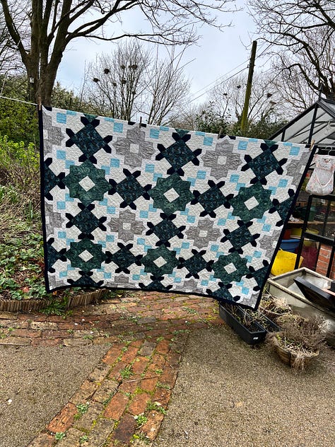 Well, I know that's cheating a little... because I finished Cath's Coastal quilt in May. But I didn't get to see it on her bed in her new condo until September. Aiden's quilt is deceptively simple. I used a sea themed "layer cake" I thought I might use for Cath's quilt but the collection was a little too subdued. The challenge came in creating something a 19 year old male would like (and hopefully treasure.) And in giving each 10" block some interesting geometric quilting in black thread for contrast.