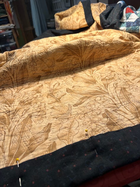 Putting the actual quilt top together has its own rhythm and energy. Sew two pieces of fabric together, add that assembly to more pieces and you've created a fabric building "block." Sew two or more blocks together and you create a new visual landscape. Every time I go to the ironing board to press the seams it's a magical reveal of a new patterned fabric unfolding like the twist of a kaleidoscope. But most of that work happens during the day. It generates excitement and anticipation. It is not conducive to relaxation and unwinding. For that I need to don my earbuds and thimble, enfold myself in a good story and stitch myself back together from whatever I've been doing all day.