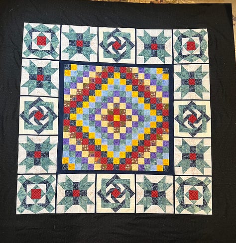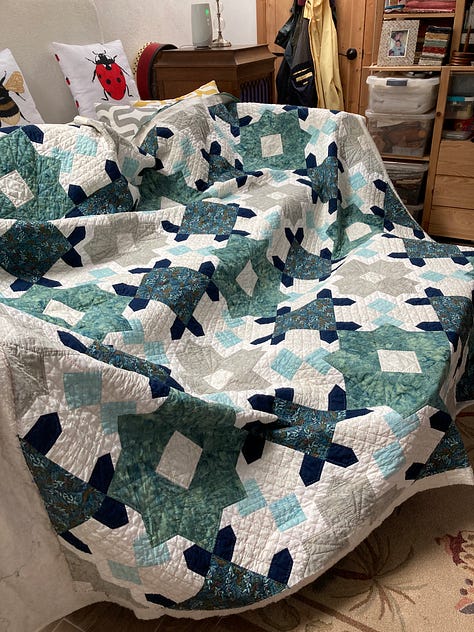 Nicki's quilt was a major challenge, each block of symbolic significance (Sister's Choice, Storm at Sea, Slip Knot, Trip Around the World) and each needing a different quilting pattern. The border, because it was so wide, needed special attention—a balance of geometric lines and curves. I found a stencil for a spiral seashell that worked perfectly! The decision to use only fabric (for the top) that I already had, including some batiks that Nicki had brought me (decades ago) from Indonesia, also put me on my current path—I've resolved to use (as much as possible) whatever I have in my stash in various kinds of "scrap" quilts.
